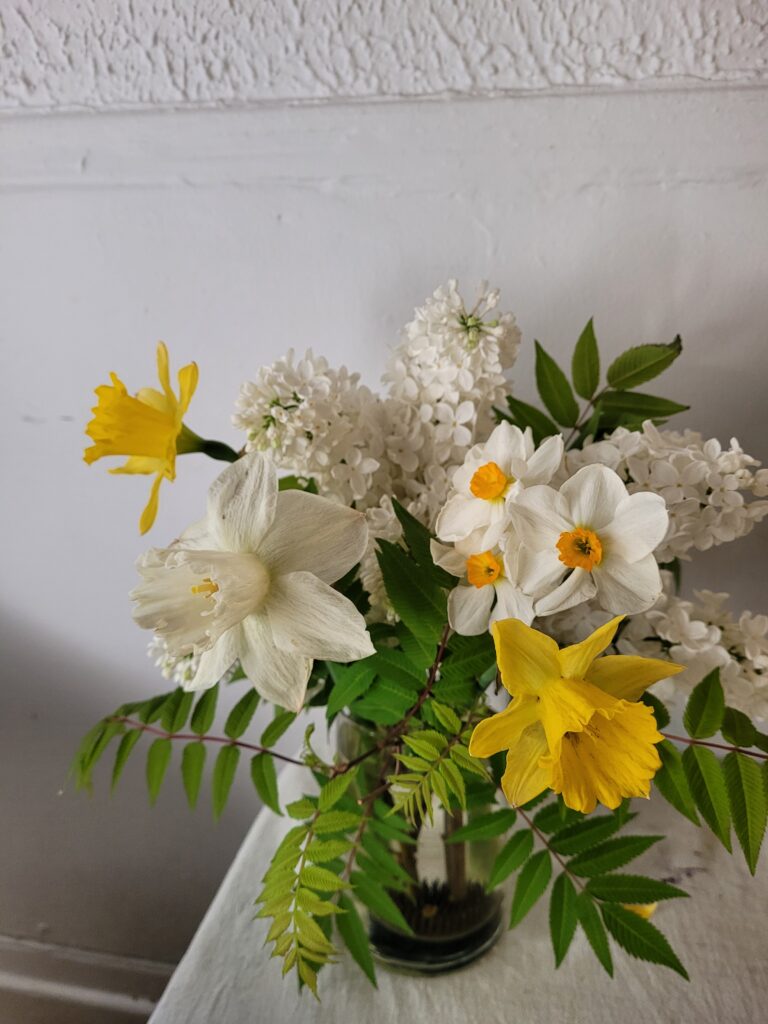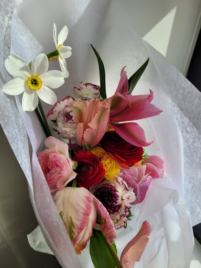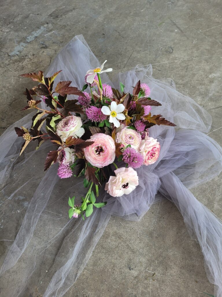 Spring nuptials package: A la carte florals of beautiful local flowers, designer's choice. Personal wedding party flowers, bud vases and floral styling for tables, one or two statement arrangements to accent the atmosphere of the space at entrance and ceremony.