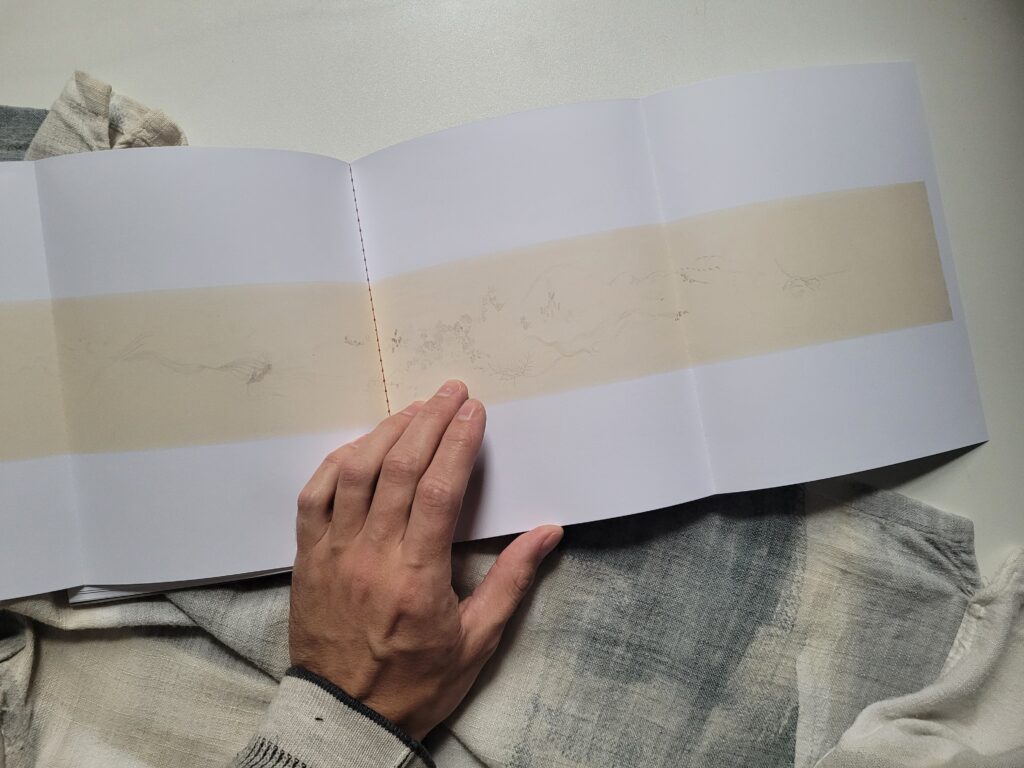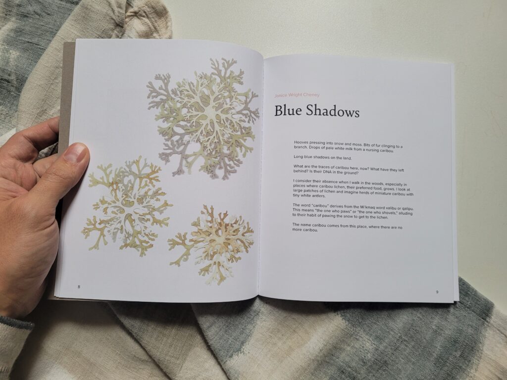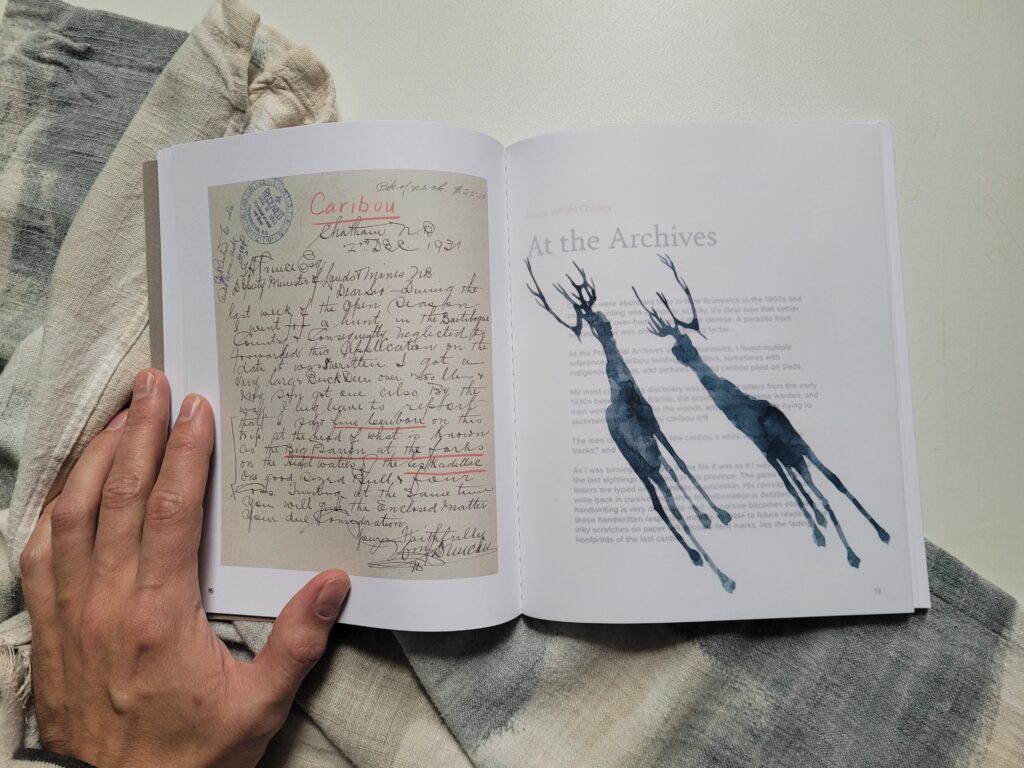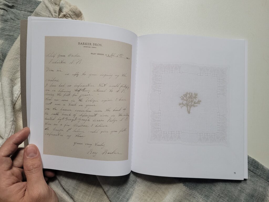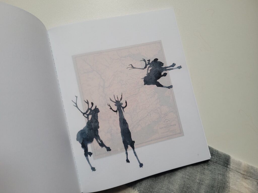 In Tracing a Caribou, you will find drawings, paintings, textile art, photography, poetry and prose. You will also find scanned letters from the NB Provincial archives of correspondence back and forth between a game warden and various people trying to ascertain if and where there are any caribou left in New Brunswick or any information about them at all. It is a beautiful book with vellum inserts, a fold out and a red stitched binding.