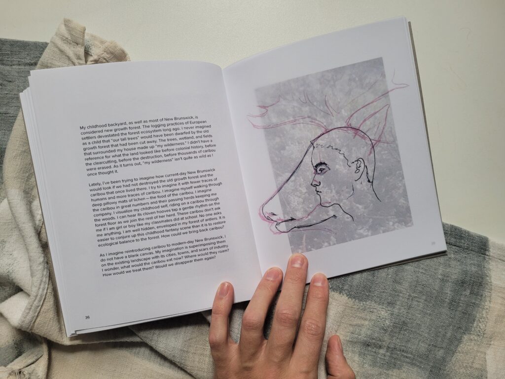 An "art book" is a term for when the book is the artwork itself. This isn't a catalog of an art exhibit or simply documentation of art work. The work was made for the book. Ours is an exploration and consideration of the missing caribou population from New Brunswick, Canada. Historically caribou lived in huge herds across the province until logging, disease and over hunting erased the population entirely by the end of the 1930's. At one point in the 1800s there were caribou hunting tourism ads circulating claiming excellent hunting grounds in what we conceive now as New Brunswick. They made great trophies for hunters because unlike other ungulates in the deer family Caribou are the only species where both the male and female adults grow antlers. Caribou have also been documented as being less shy and more curious creatures than their other counterparts like deer and moose. Making them easy targets for hunters. These caribou would have also been affected by the removal of the old growth forest and ecosystem that it supported, as logging practices removed this system almost entirely.
