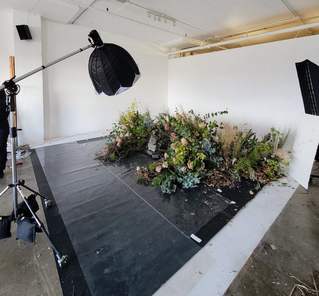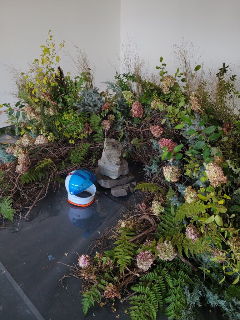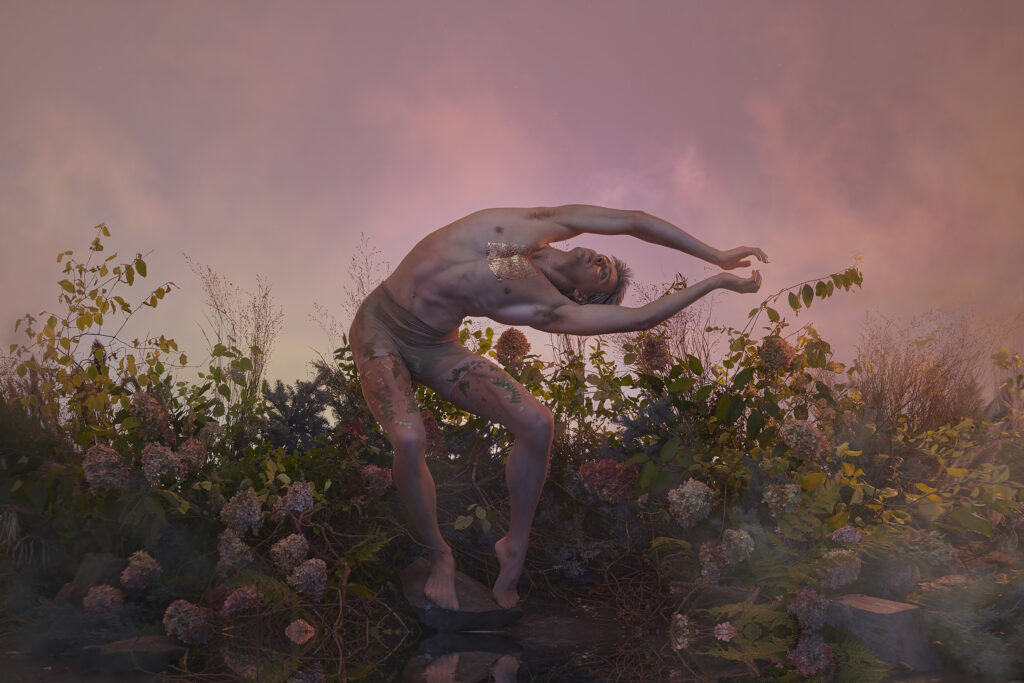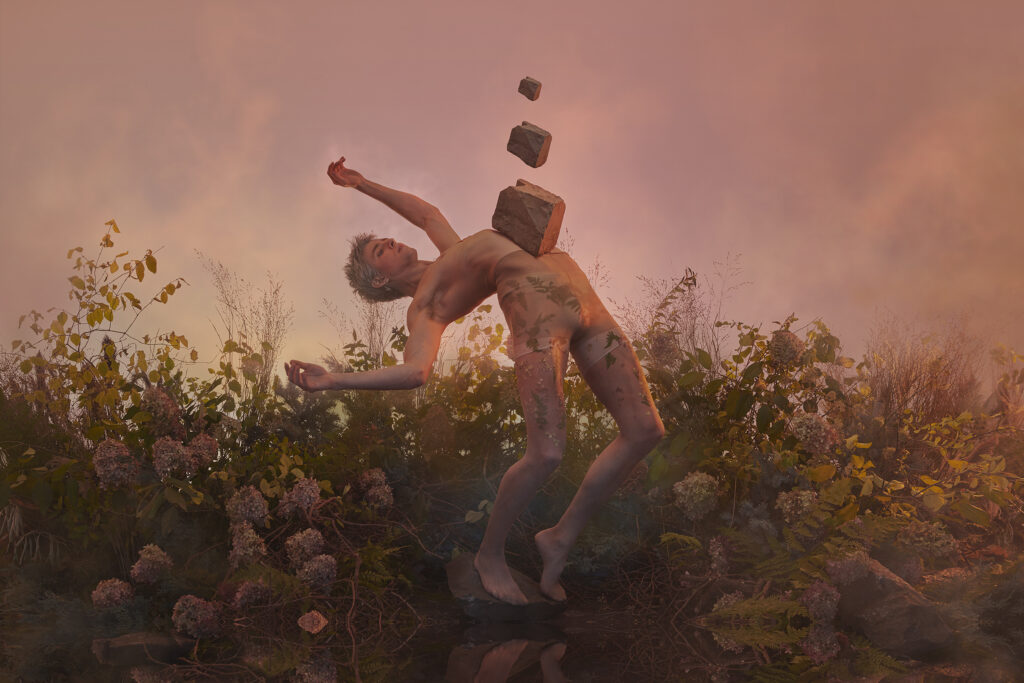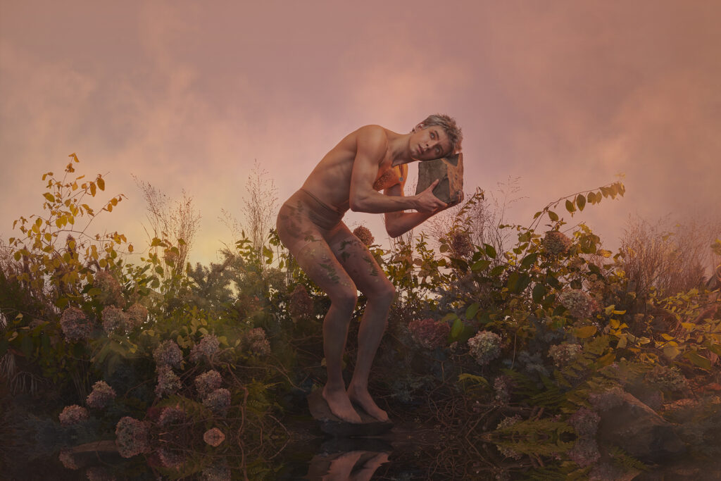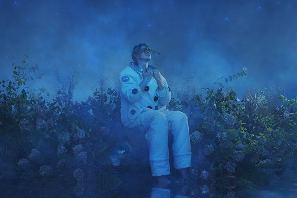 In this collaboration between Damian Siqueiros, Brin Schoellkopf and Reuben Stewart, Brin depicts an astronaut who has never been to earth in a time where it had been rendered uninhabitable. Warned of the dangers of exposing himself to the air and plants that were long left behind, Brin gingerly explores his surroundings. Nature has taken over and it is a beautiful wild reclaimed space. Brin slowly sheds his layers of space suit and connects with nature for the first time.