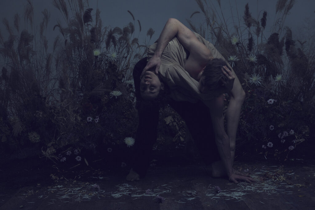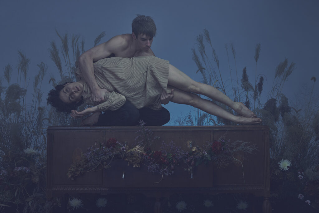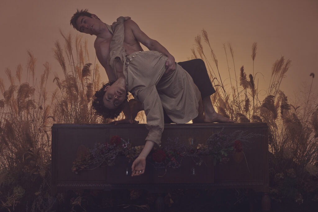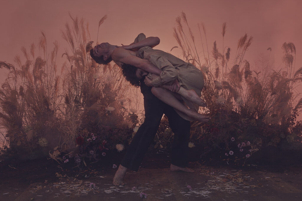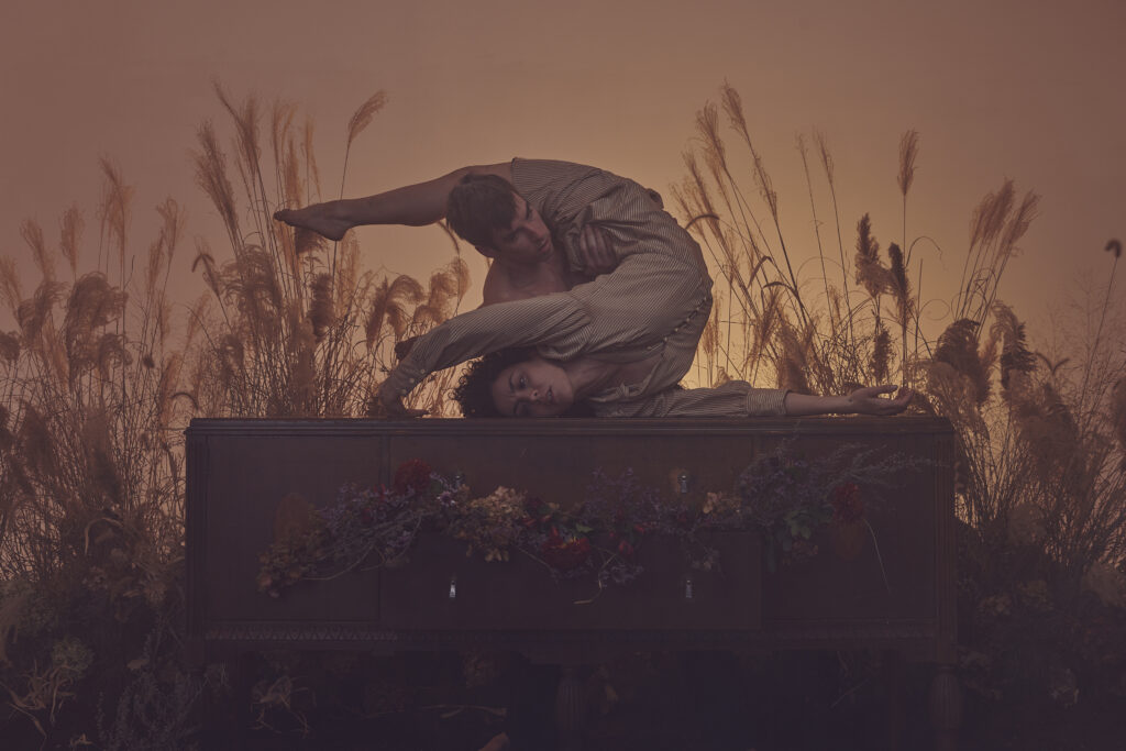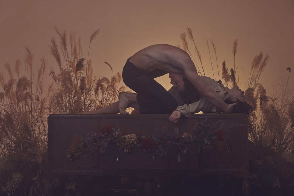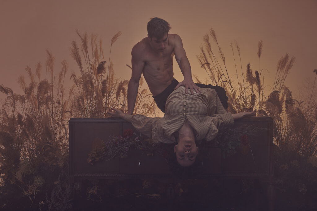 A huge swath of grasses and branches create the background for the promotion of Past Rooms — a dance production choreographed by Andrew Skeels. Antique furniture emerges and blends with the florals, fog and dim lighting of the set. The dancers bring the narrative of a woman in mourning to life.