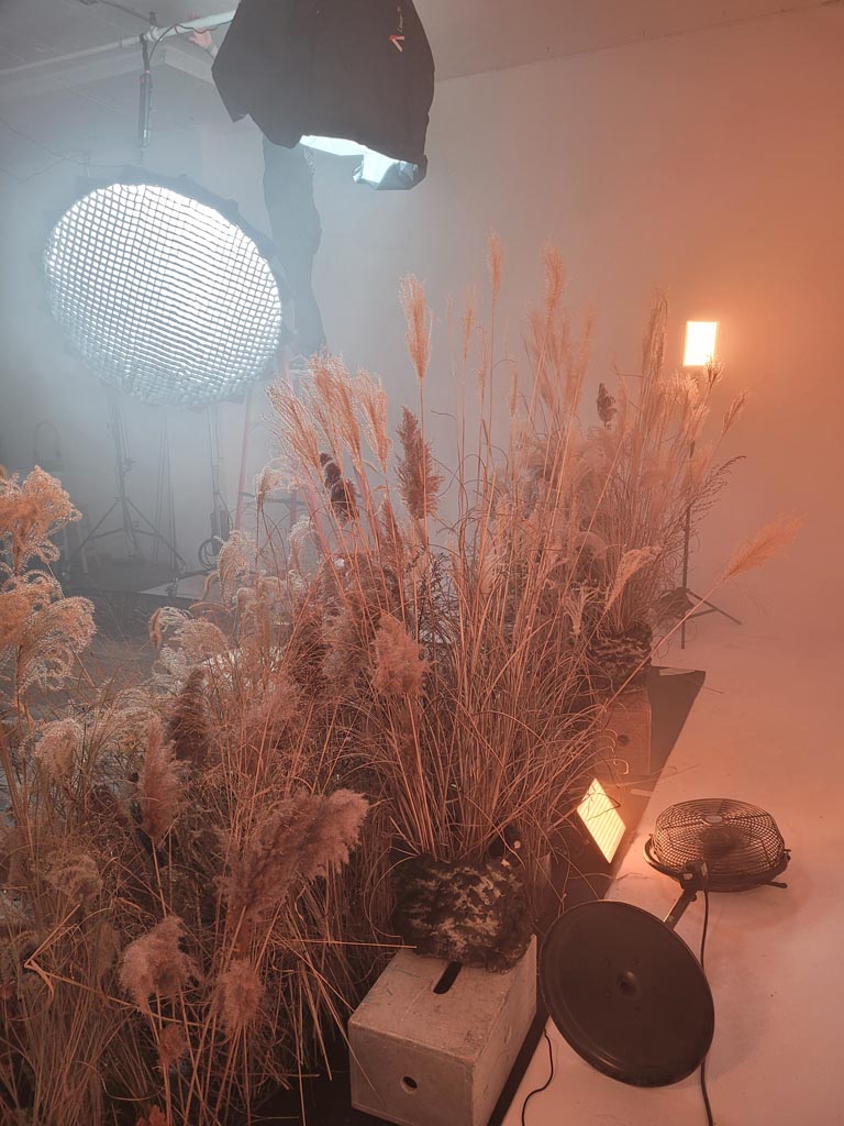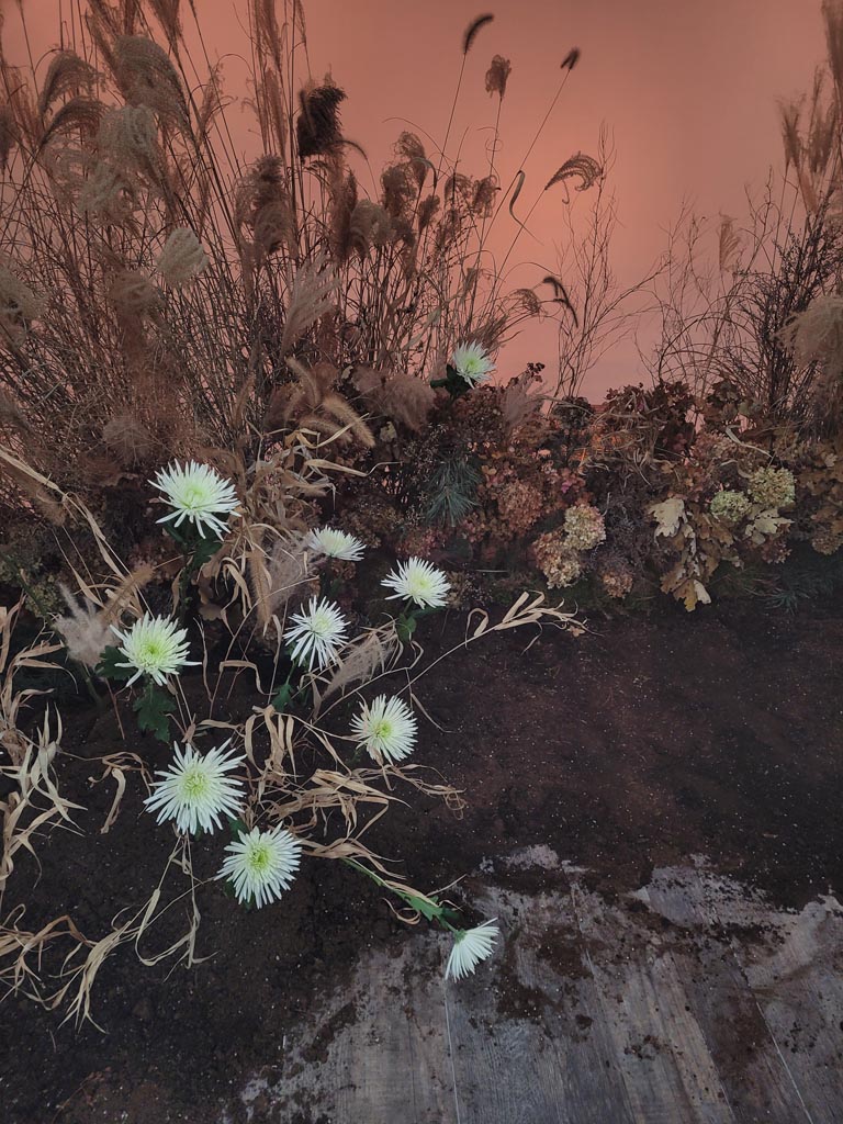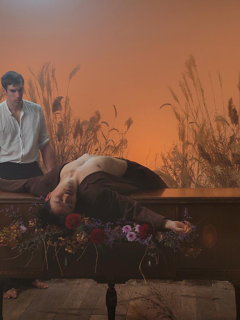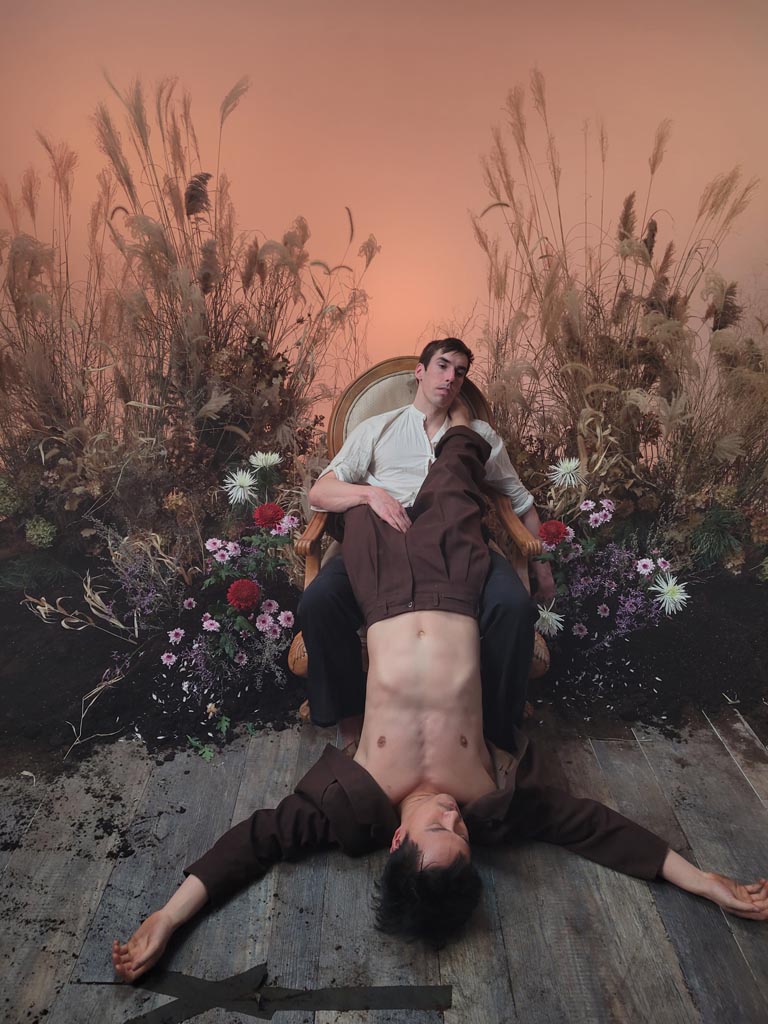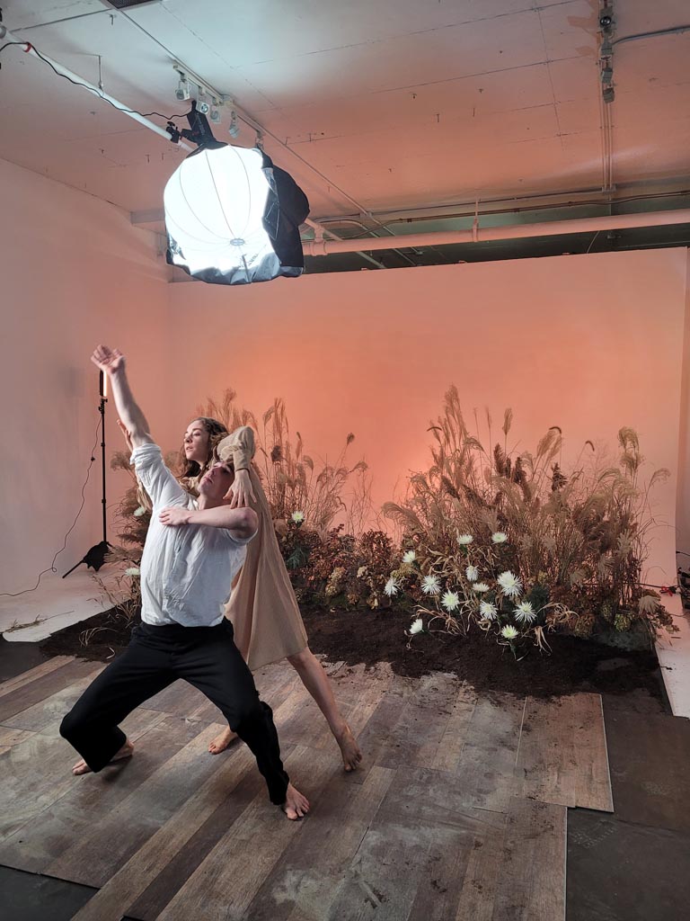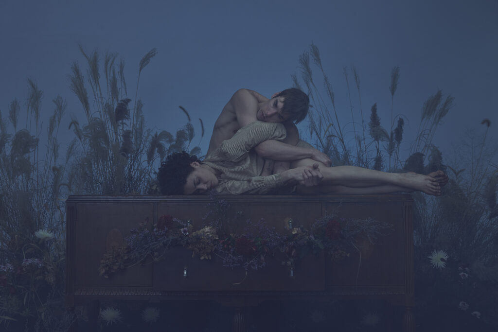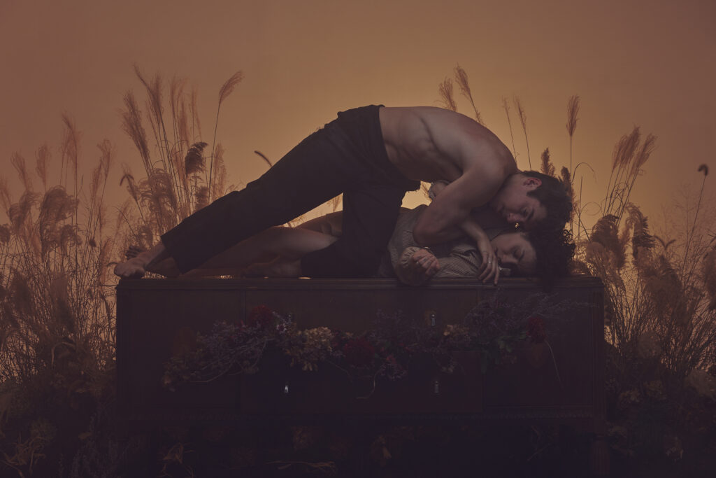 A huge swath of grasses and branches create the background for the promotion of Past Rooms — a dance production choreographed by Andrew Skeels. Antique furniture emerges and blends with the florals, fog and dim lighting of the set. The dancers bring the narrative of a woman in mourning to life.